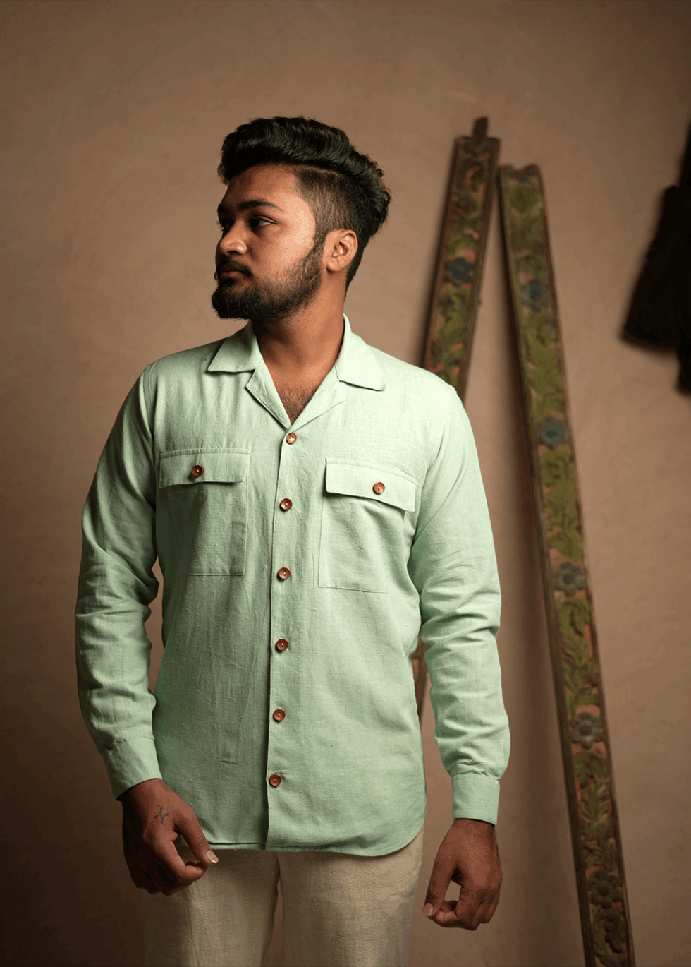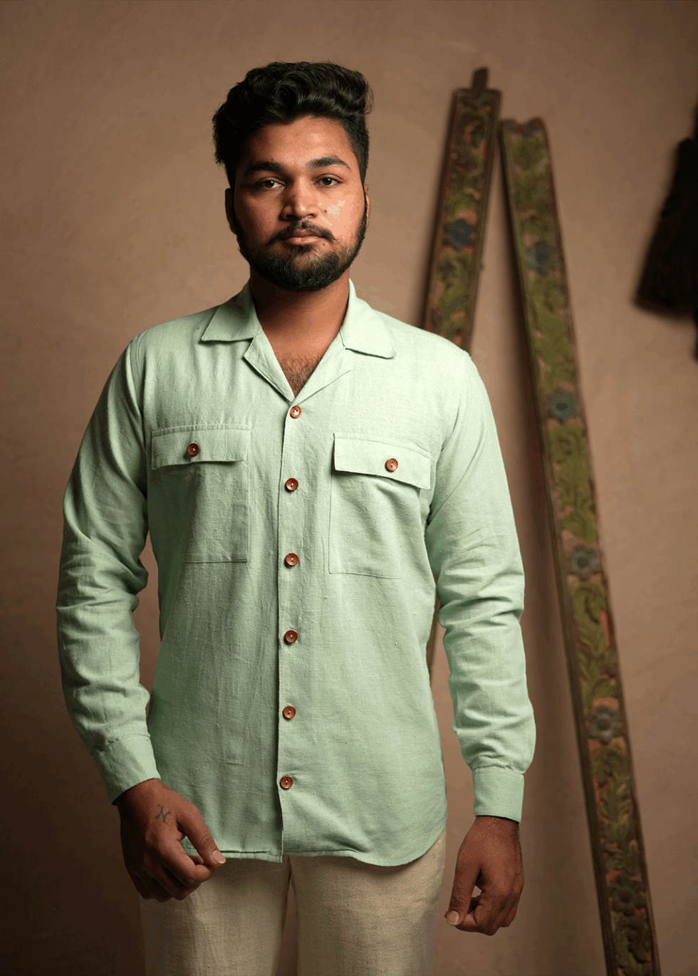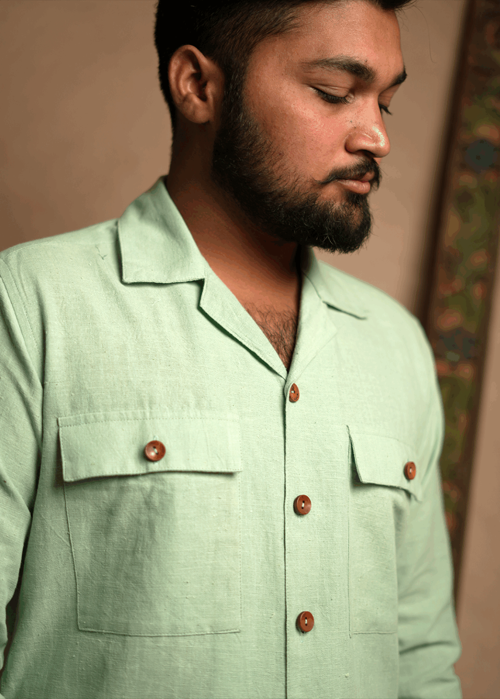 Accentuated with natural wooden buttons, blending heritage with modern sophistication